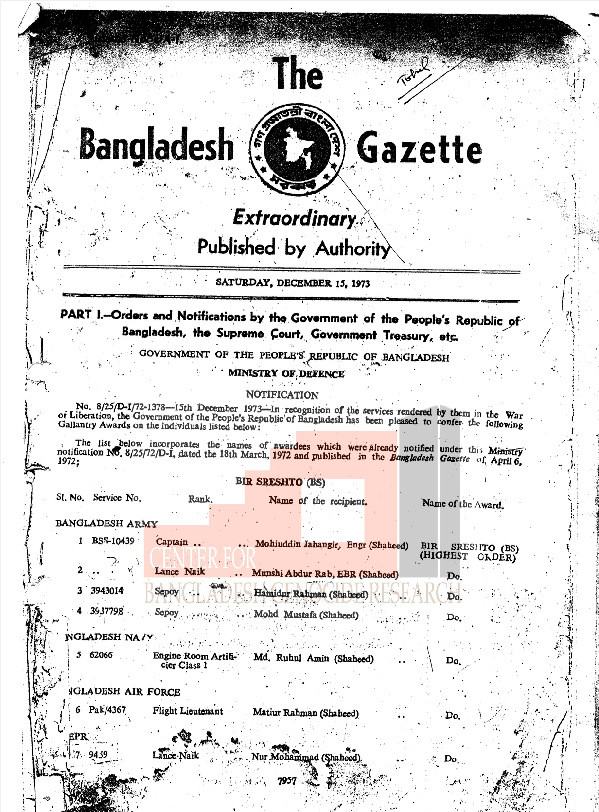 In recognition of the services rendered by them in the War of Liberation, the Government of the People’s Republic of Bangladesh has been pleased to confer the following Gallantry Awards on the individuals listed below: